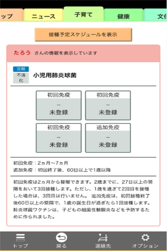 「健康」メニューでは、事前にお子さんの簡単なプロフィールを登録していただく事で、予防接種の期間や参考スケジュール、接種記録などを管理することができます。
