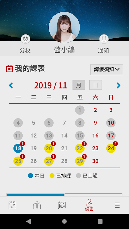 ●我的課表:個人專屬當月分校/線上真人課表及請假功能