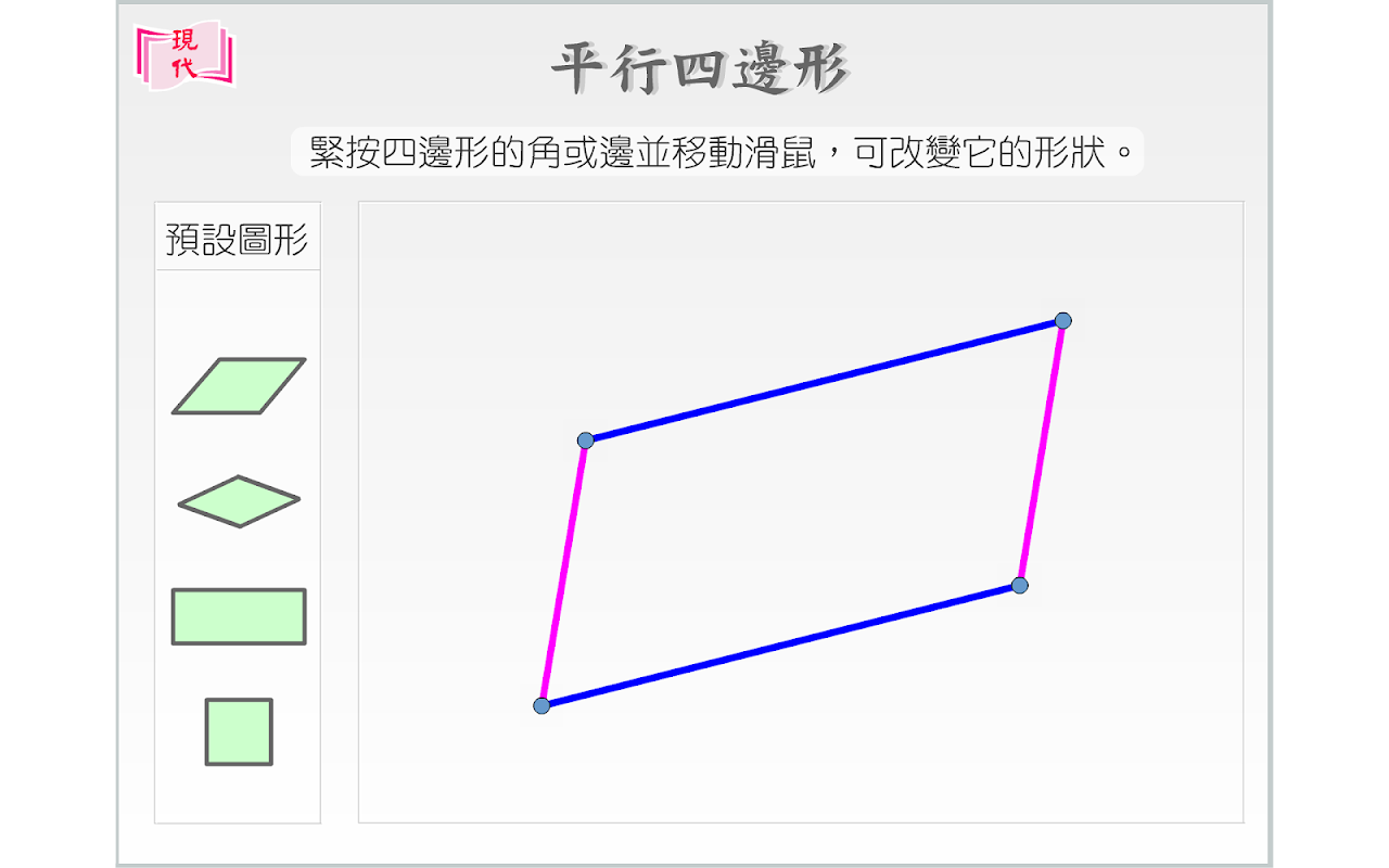 Studenten den Voreinstellungen viereckige Form durch Berührung mit dem Finger, damit die Studierenden die Eigenschaften eines Parallelogramms zu verstehen.
