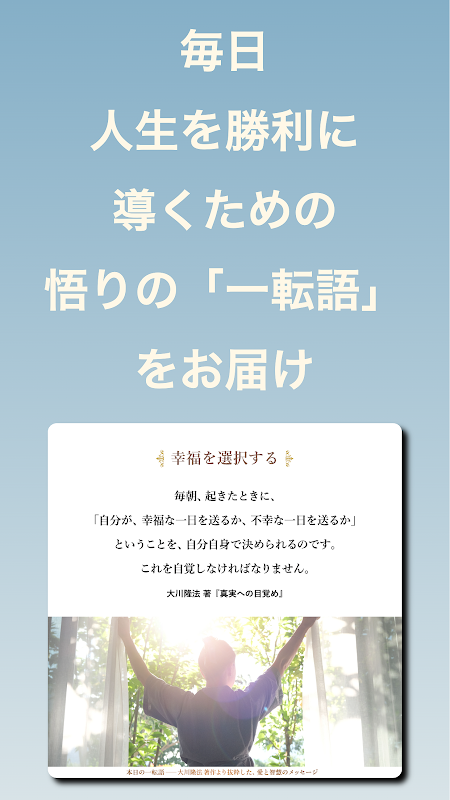 Die „Happiness Science Official App“ basiert auf dem Konzept „Verbindung zum wahren Glück herstellen“ und bietet verschiedene Inhalte und Funktionen, die zum individuellen Glück führen, einschließlich der Lehren von Meister Ryuho Okawa.