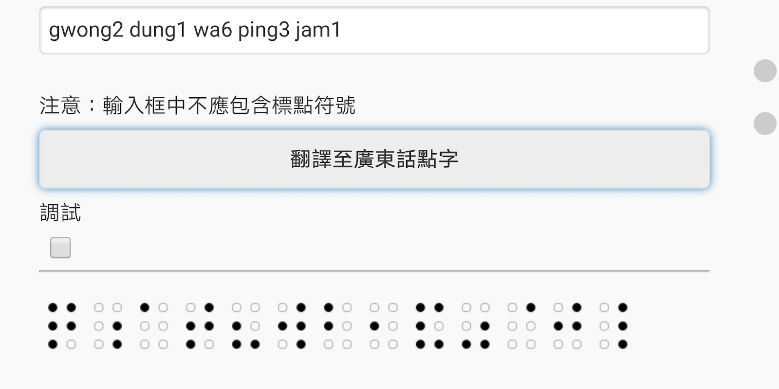 Kantonesisch-Braille-Übersetzer, der das Kantonesische Pinyin (Pinyin-Programm der Pädagogischen Hochschule) verwendet, um Chinesisch in Braille umzuwandeln.