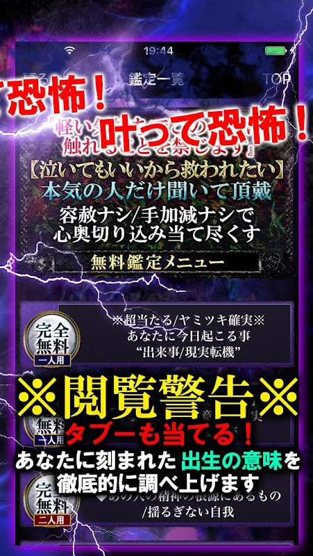 知ったが最後逃げ隠れはできません。あなたの過去を手繰り、現在を暴き踏み込み当て尽す。本当に怖いほど当たる占いをあなたの目で確かめてください。