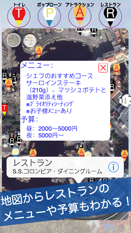 iPhone版では地図機能が追加されておりポップコーンの売り場やトイレの場所と個室数、アトラクションにレストランなど、待ち時間だけでなくお役立ち情報がたくさんあります。