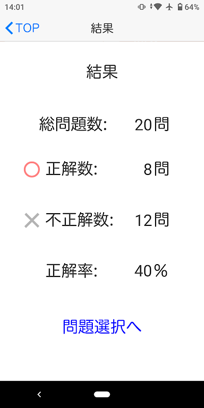 学習では、1問毎に正誤判定され、学習の最後に正解数と正解率を確認できます。