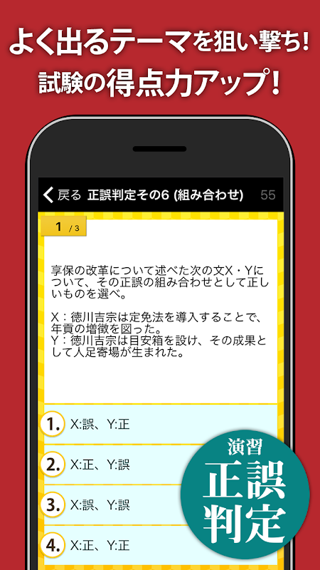 Schaffen Sie mit dieser App eine Grundlage für die regulären Geschichtsprüfungen der Oberstufe, die umfassenden Geschichtsprüfungen und die allgemeinen Hochschulaufnahmeprüfungen, die Sekundarschulprüfungen in japanischer Geschichte, Webtests und die Beamtenprüfungen!