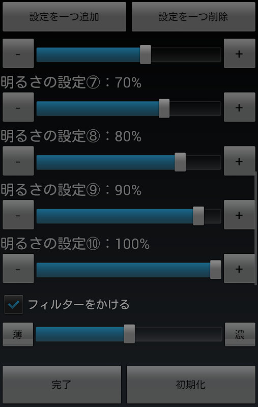 設定画面で自分の好みに合わせた2個~10個の輝度の設定が行えます。