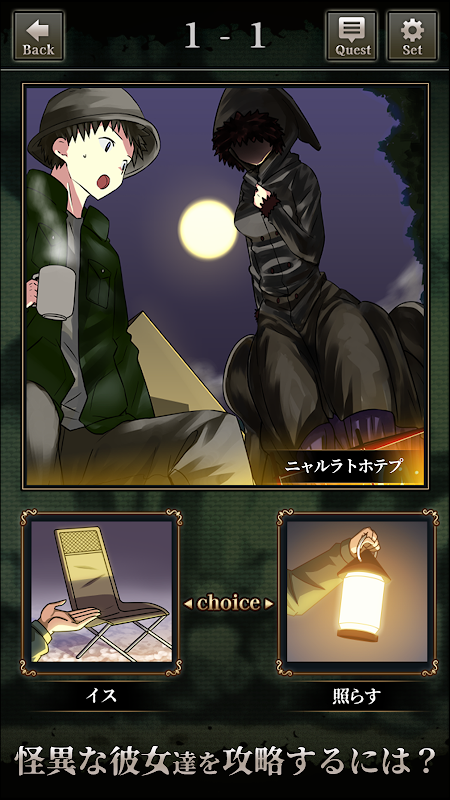 Um die Monster (schöne Mädchen), die in Cthulhu auftauchen, und die weltberühmten mysteriösen schönen Mädchen (Youkai, Monster, Geister) glücklich zu machen, ist es ein Quizspiel, das die Geschichte vorantreibt!