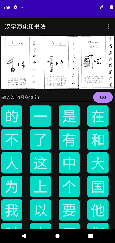 Klicken Sie auf Los, um das Evolutionsdiagramm jedes chinesischen Zeichens anzuzeigen und das Mao, das reguläre Skript, das laufende Skript und das Siegelskript der chinesischen Zeichen zu schätzen.