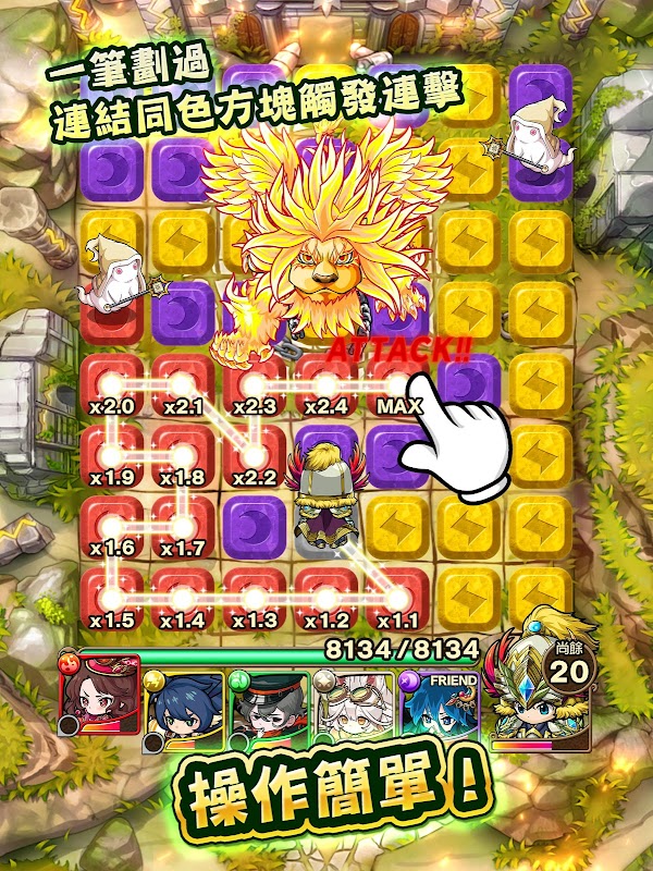遊戲支援最大4人連線合作,玩家可以邀請身邊的朋友一起挑戰合作專用關卡,通過隊 友所在方塊時隊友會一起參與攻擊,合力打倒魔物領取限定獎勵吧。