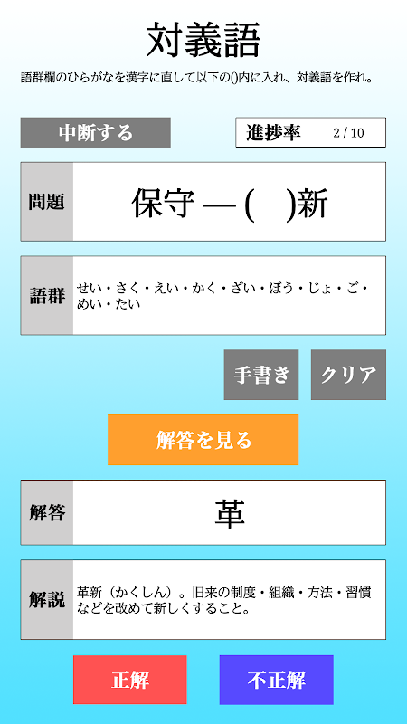 Die meisten anderen Lernwerkzeuge beinhalten nicht die Bedeutung der in der Prüfung verwendeten Kanji. Diese App enthält Erklärungen für fast alle Probleme, sodass Sie nicht jedes Mal im Wörterbuch nachschlagen müssen, wenn Sie auf eine Redewendung stoßen, die Sie nicht verstehen. Indem Sie sich die Bedeutung zusammen mit der Antwort merken, können Sie die Erinnerungsrate erhöhen.