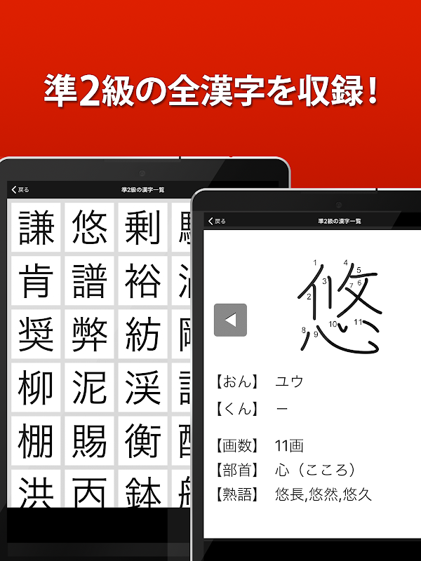 Darüber hinaus ist es mit einer Listenanzeigefunktion für alle 328 Kanji ausgestattet, die ab Kanji Kentei Level 2 abgefragt werden.