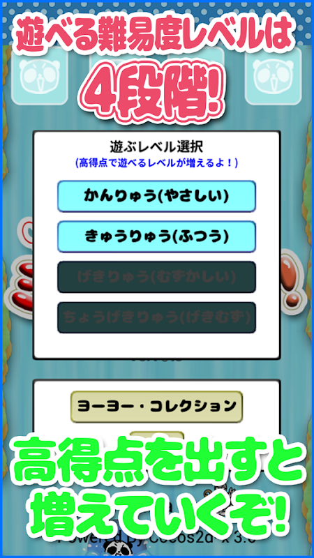 遊べる難易度レベルは4段階。それぞれのレベルで高得点を出すと遊べるレベルが増えて行きますよ。