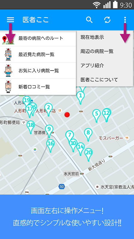 病院検索アプリ「医者ここ」は、全国の病院を地図上で探すことができるAndroidスマートフォンアプリです。外出先で近くにある病院を探したり、診療科目から探す・病院名から探すなど検索機能を備えています。