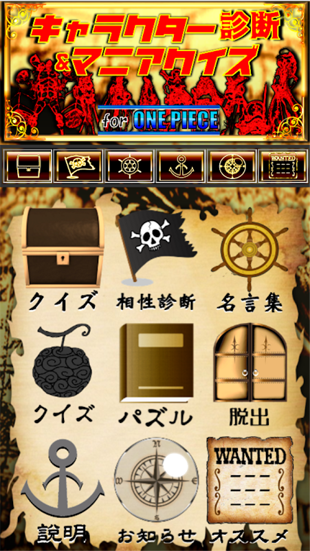 ワンピース(ONE PIECE)の原作、映画やアニメなどから知識に関するクイズ問題を出題するゲームとキャラクター相性診断が出来る非公式・非公認アプリです。