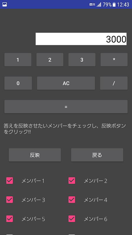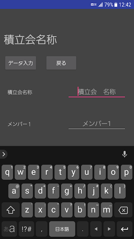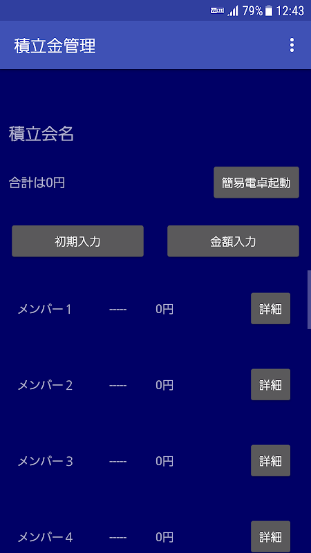初期設定にて会のグループ名、各メンバー名の入力を行い、集金の金額を入力します。後で集金日、集金金額等を確認出来ます。誤入力の際は 「直前取り消しボタン」にて一回分の入力を戻す事が出来ます。