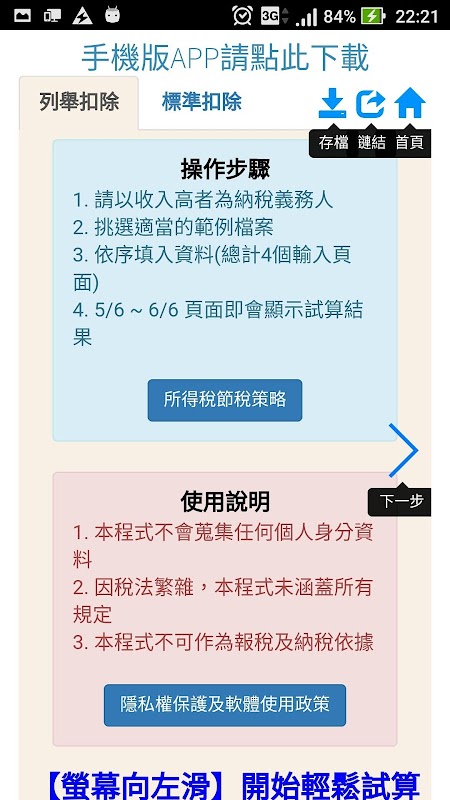 本程式提供綜合所得稅最新稅級及扣除額表,並提供歷年資料作為比較,並有各扣除額報稅注意事項提示,以及所得稅網頁版試算軟體鏈結。若您使用Android 4.0以上的手機,建議安裝手機版試算軟體(https://play.google.com/store/apps/details?id=tw.ewin.taxcalulate)