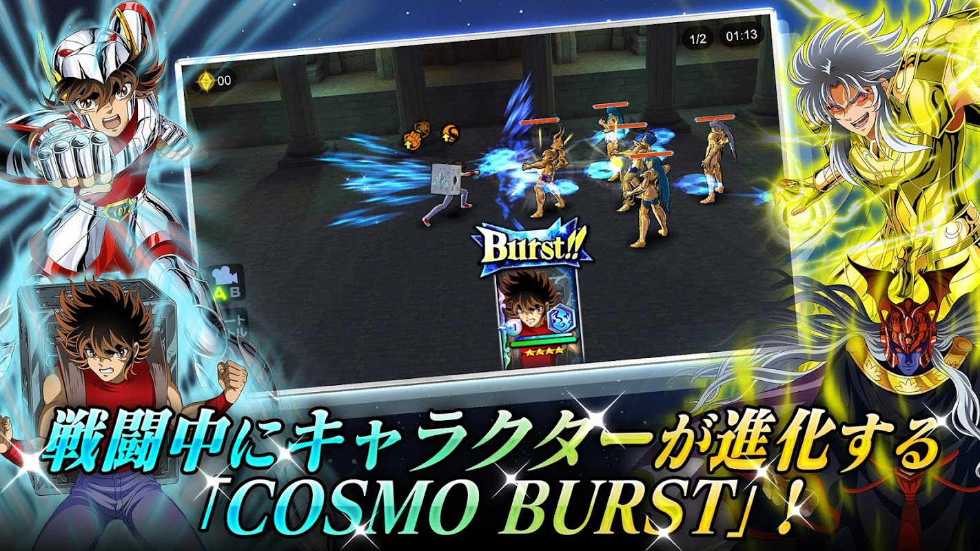 原作を追体験する「ストーリー」や「聖闘士育成クエスト」でチームを強化し、ユーザー同士で競い合う「闘技場」や「グラードコロッセオΩ」など多彩なゲームモードで頂点を目指そう!