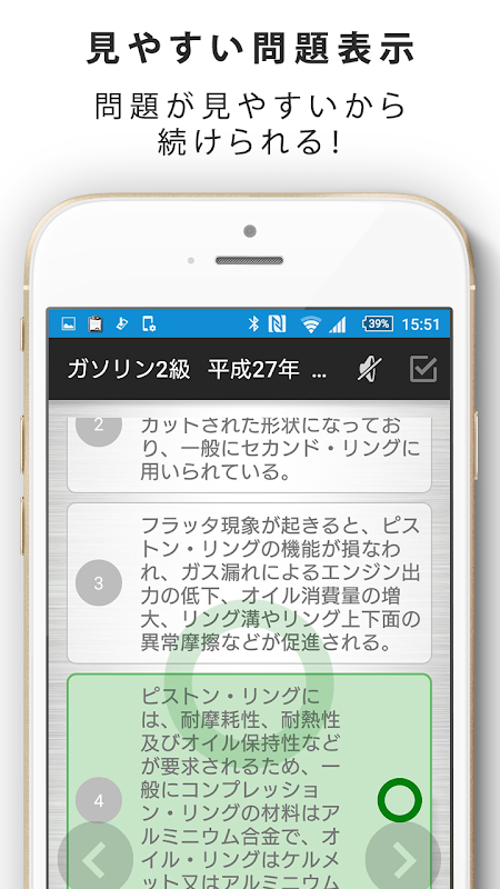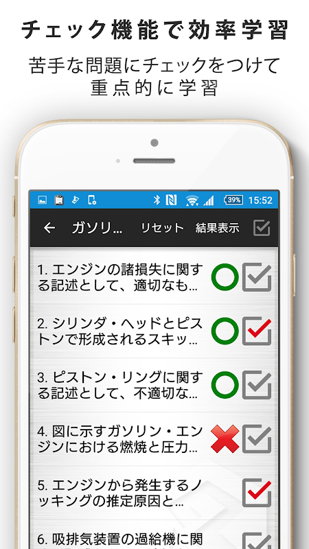 Fordern Sie jederzeit und überall Prüfungsfragen heraus! Die Ergebnisse jedes Tests werden mit der richtigen Antwortquote für jeden Bereich von [Motor], [Fahrwerk], [Wartungsausrüstung usw.] und [Vorschriften] angezeigt, sodass Sie Ihre Schwächen kennenlernen und diese überwinden können. Sie können die gleichen Prüfungsfragen auch noch einmal ausprobieren.