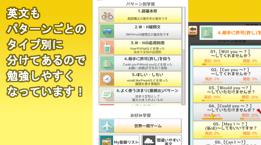 Es ist eine Anwendung, mit der Sie 98 Muster häufig verwendeter englischer Konversationen gründlich lernen können. Lerne Englisch Konversation 920 Beispielsätze mit [Muttersprache / Englisch Übersetzungsproblem / Hörproblem / Leicht verständliche Erklärung]!