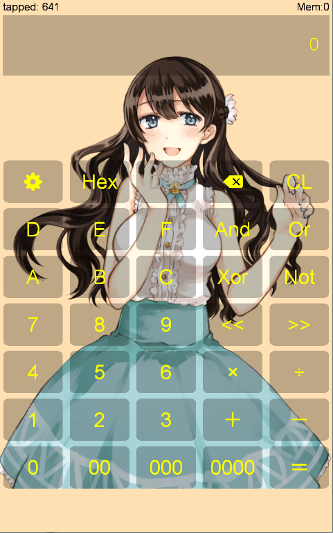 四則演算のみの普通の電卓とプログラマ向け16進数の電卓背景は萌え萌えな女性画像。使い込むと画像が増えるよ。