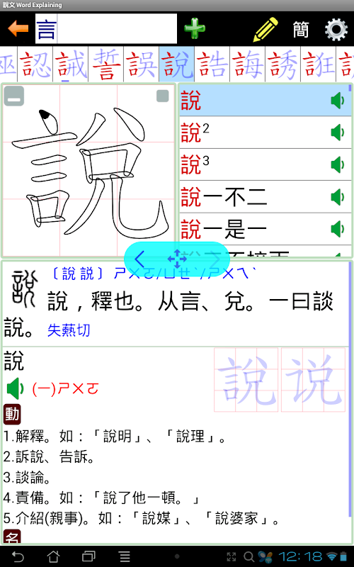 (1)單字列表: 列出以「輸入偏旁」搜尋到的單字,順序是以筆劃數來排列。