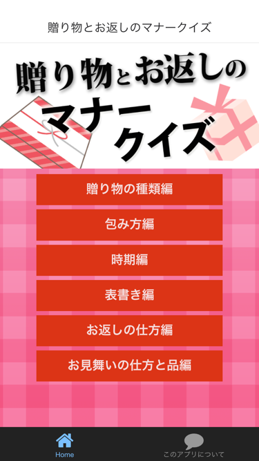 贈り物とお返しのマナーに関するクイズに挑戦できる無料アプリです。お見舞いや結婚祝い、御歳暮など様々な贈り物、お返しに関するクイズに挑戦できます。