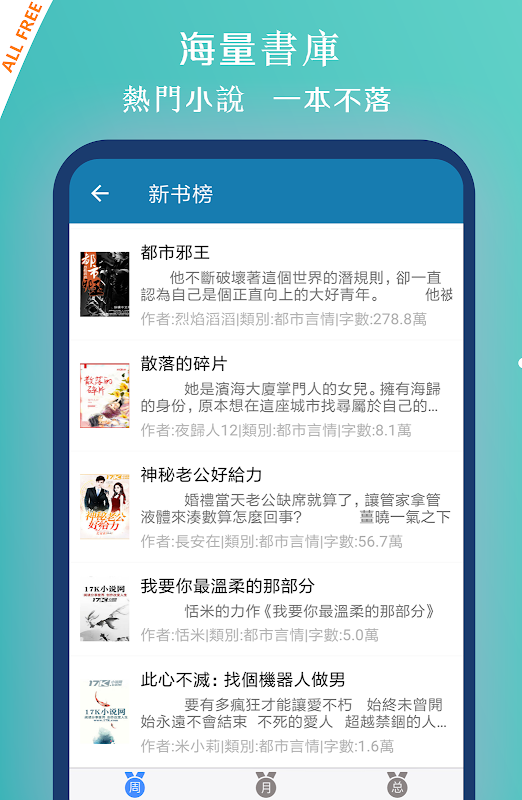Eine Sammlung von Romanen, die von Jungen und Mädchen geliebt werden, mit einer riesigen Bibliothek beliebter Bestseller-Romane, reich an Genres, die Liebesromane, Zeitreiseromane, herrschsüchtige Präsidenten, Palastkampfromane, Fantasy-Kultivierung, historisches Militär und Science-Fiction umfasst Übernatürliches, Horror und Suspense usw.; lehnen Sie die Buchknappheit ab, Tausende von Originalromanen haben alles!