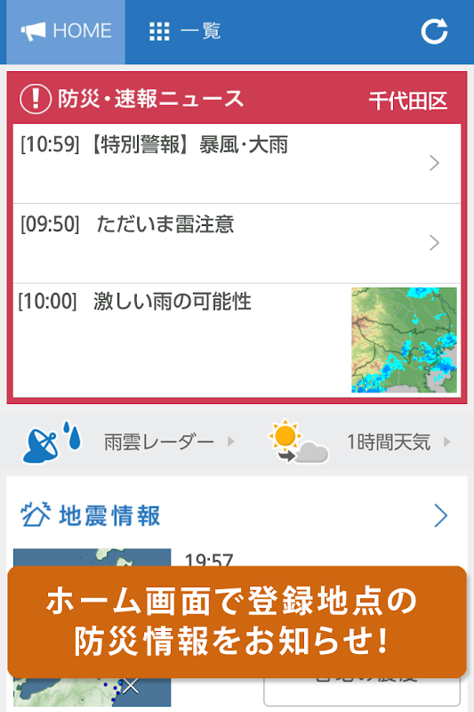 Sie sehen auf einen Blick Informationen zur Katastrophenvorsorge und Wettervorhersagen wie Erdbeben, Taifune, Starkregen, Blitze und Tornados.