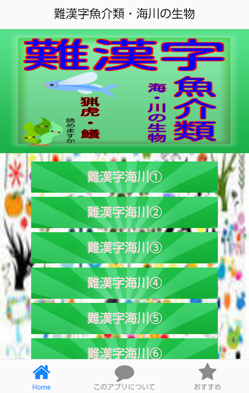 ・魚介類・海川の生物の漢字を拓一形式のクイズアプリです。