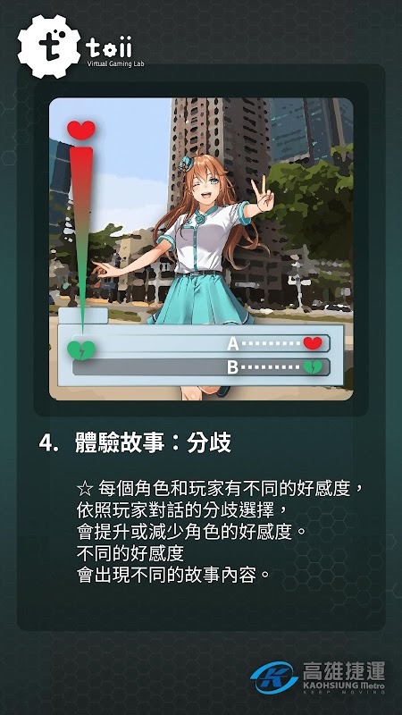 「跟著高捷少女,一起去旅行~」結合擴增實境(AR)和GPS,從高雄捷運延伸出來,將結合高雄、台北以及日本博多在地的觀光景點的手機美少女戀愛遊戲!