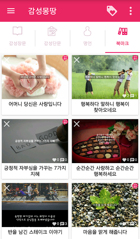 감성글귀 및 명언을 읽고 저장하고 싶은 글귀를 북마크 기능을 활용하여