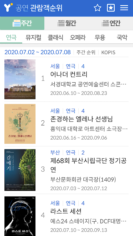 지난 달의 공연별 관람객 순위를 확인할 수 있습니다.