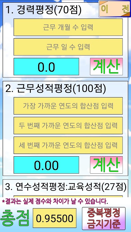 강원, 경기, 서울, 충남, 충북 지역의 승진평점점수를 계산할 수 있습니다.