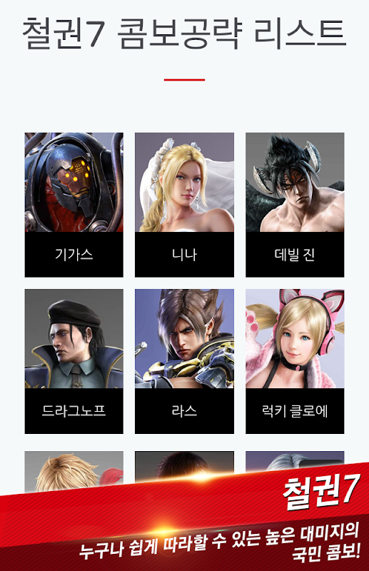 - '철권7' 국민트리가 신설되었습니다! 쉽고 빠르게 대미지를 넣을 수 있는 콤보! 모든 캐릭터의 국민콤보를 제공합니다.