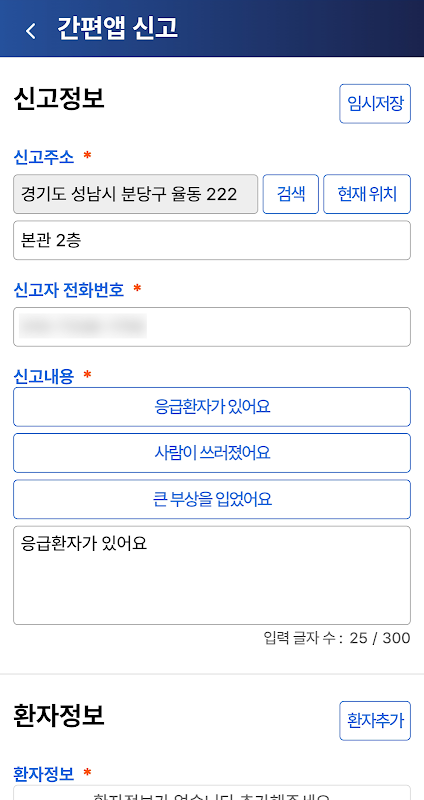 - Einfache App-Berichterstattung: Unterstützt die Notfallberichterstattung durch Eingabe von Berichtsinformationen (Standort, Telefonnummer, Bild usw.) und Patienteninformationen.