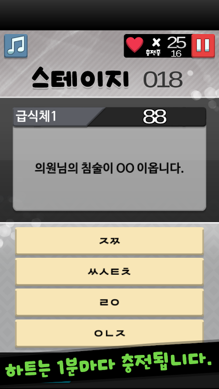 ▶연속하여 5문제를 맞추면 하트 3개씩 충전됨◀