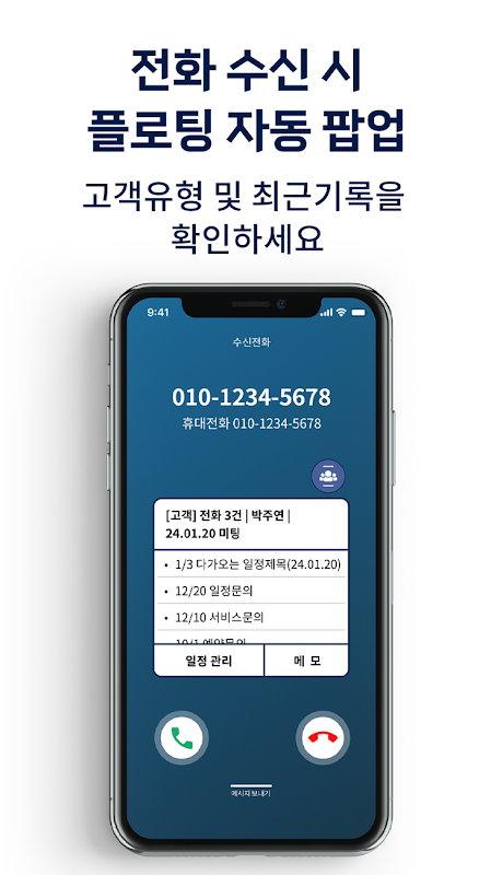 - Wenn Sie einen Anruf erhalten, wird ein schwebender Bildschirm mit der Kundenhistorie angezeigt, sodass Sie den Kundentyp und den aktuellen Zeitplan überprüfen können.