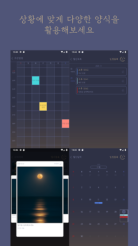 - 월마다 관리할 수 있는 월간 달력과 매 주 반복되는 일정을 기록할 수 있는 주간 달력을 제공합니다.