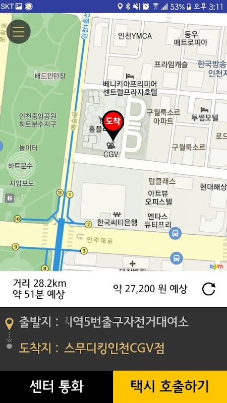 - 차량위치정보제공(배차후 손님위치까지 차량이동상황, 도착시간 제공)