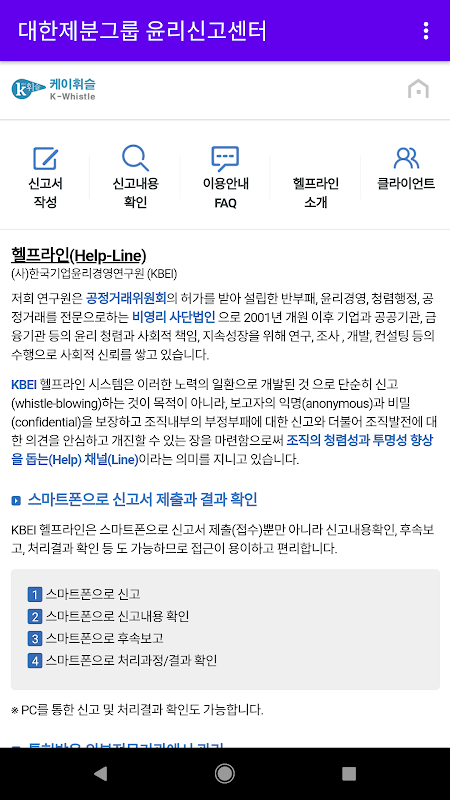 대한제분그룹 윤리신고센터 APP을 제작, 배포하고 있는 한국기업윤리경영연구원(KBEI)은 기업, 금융, 공공기관의 윤리적인 경영을 지원하기 위하여 설립된 국내 최초의 윤리경영 전문 연구기관 입니다.