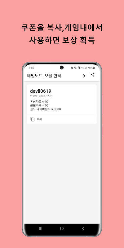 Verwenden Sie den Coupon, den nur ich nicht verwenden konnte, bevor er abläuft. Sie können die Coupon-Informationen von „Devil Note: Treasure Hunter“ anzeigen und eine Push-Benachrichtigung erhalten, wenn ein neuer Coupon ausgestellt wird.