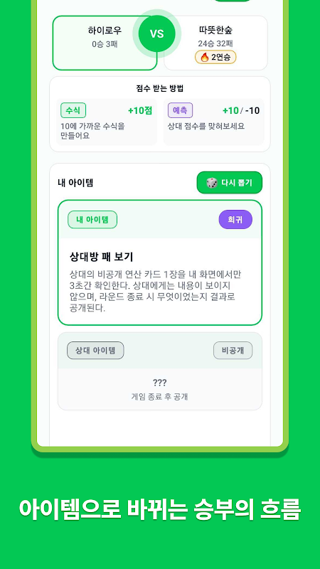 – Wenn einige Karten deines Gegners aufgedeckt werden, tippe auf das Ergebnis und wähle NIEDRIG, HOCH oder GENAU (genau 10). – Du kannst den Spielverlauf ändern, indem du einen zufällig bereitgestellten Gegenstand während des Spiels verwendest.