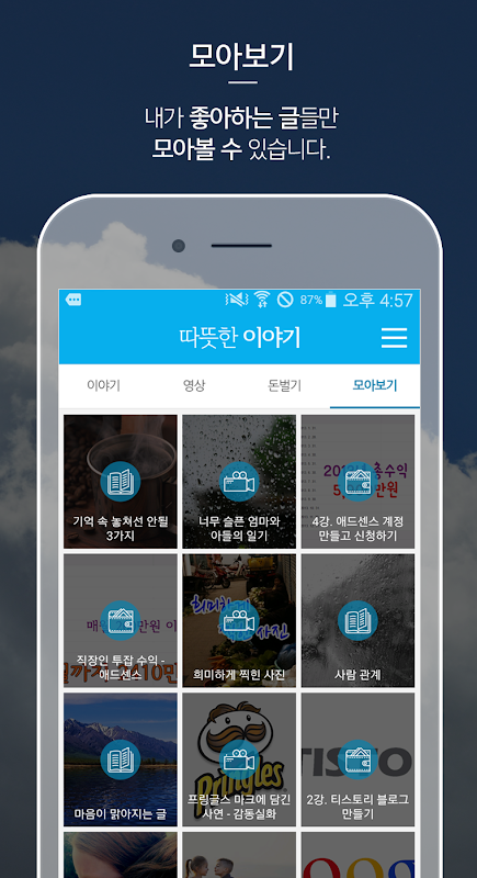자신이 좋아하는 좋은 글귀와 명언, 감동이야기 등을 한곳에 모아서 볼 수 있 습니다.