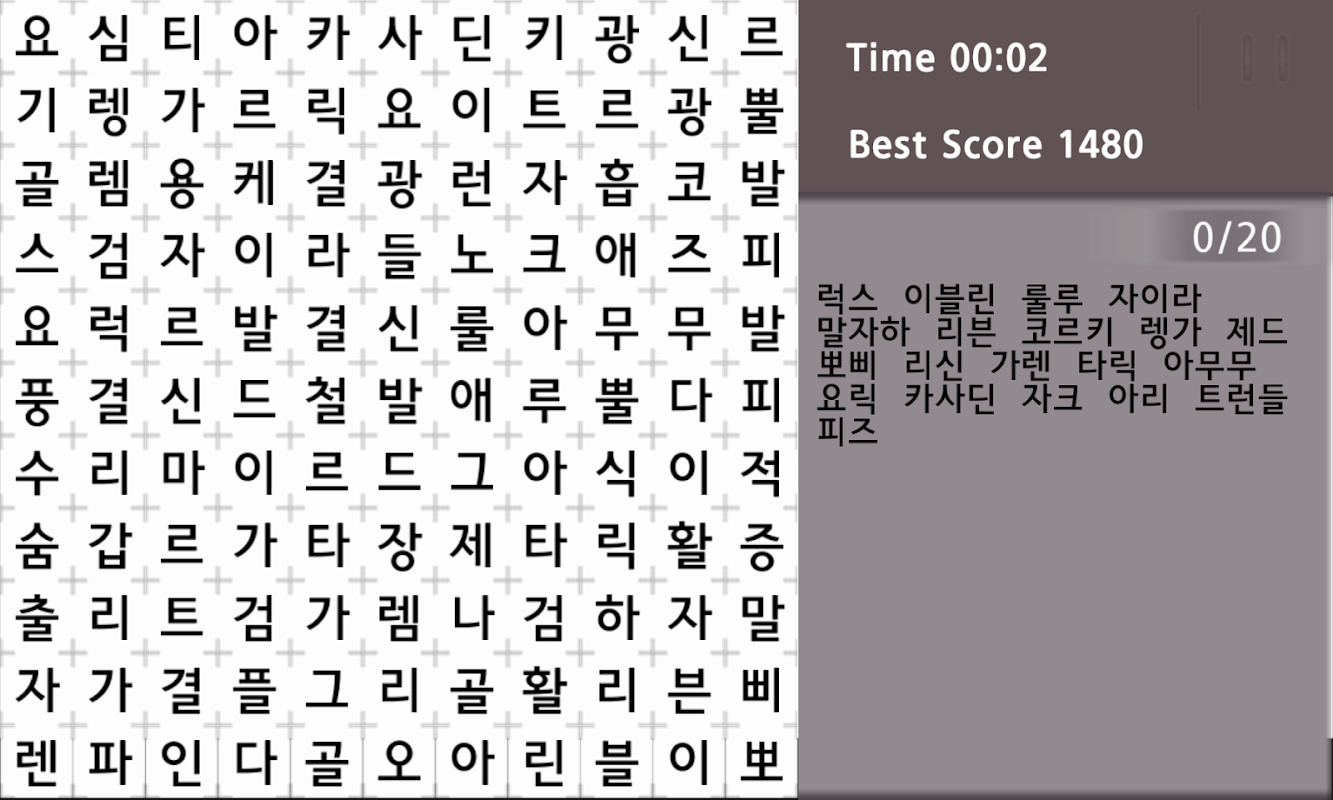 롤과 관련된 영웅, 아이템, 스킬, 프로게이머 등등 단어를 빨리찾아서 고득점을 기록해보자!