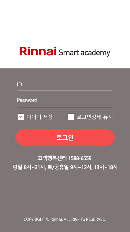 PC환경의 린나이 스마트 아카데미(http://rinnai.hunet.co.kr)의 아이디와 비밀번호로 로그인 가능하며, 주요 서비스를 본 모바일 앱에서도 사용하실 수 있습니다.