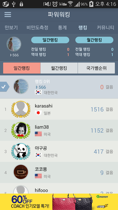 전세계 개인별,국가별 만보 랭킹전이 시작됩니다!걸음수,소비칼로리,거리,보행시간,시속과 함께 비만도측정,월별 걸음수,몸무게 통계 그래프를 제공.