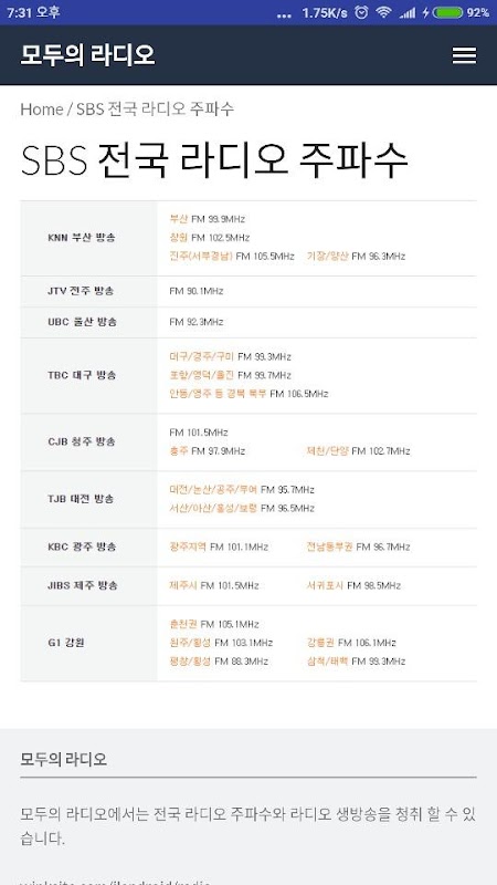 - 한국(KOREA) 40개 이상의 실시간 라디오 청취 가능