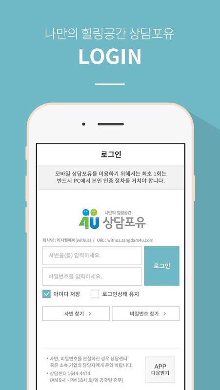 * 모바일 상담포유는 안드로이드 2.3.3, ios 7.0 이상 버전부터 지원 가능합니다.