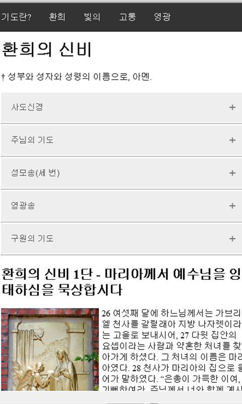 천주교 신자들이 즐겨 바치는 묵주기도를 초신자나 기존 신자들이 두루 쉽게 바칠 수 있도록 각 단 마다 기도문과 말씀을 제시하여 쉽게 묵주 기도를 익히고 바칠 수 있게 하였습니다.