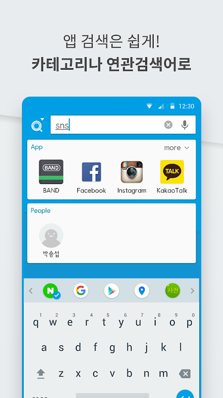 스마트폰에 설치된 앱 검색, 전화번호 검색, 바로가기 검색을 지원하고 네이버, 구글, 다음, 지도 등 38가지의 다양한 검색이 가능합니다.